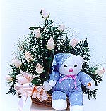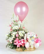 ARREGLO PARA NACIMIENTO DE NI�A ,FLORES VARIADAS CON PELUCHE Y GLOBO,CODIGO:01635 PRECIO:14000
